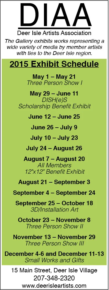 Be sure to stop in at Deer Isle Artists Association’s Gallery in the building next to the library. DIAA member artists display their work in rotating shows throughout the summer.